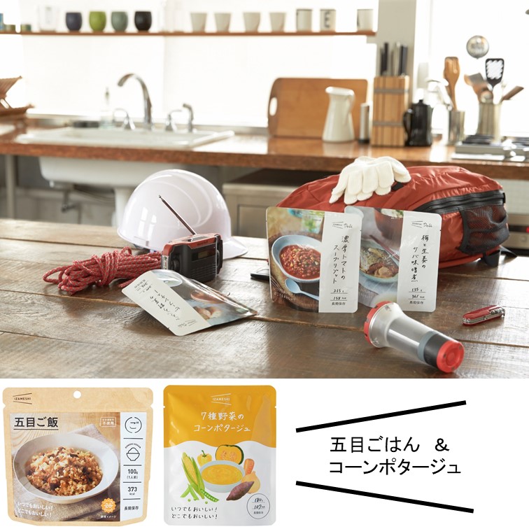 いざという時の防災食を実際に試食してみませんか?「五目ご飯」「7種野菜のコーンポタージュ」「フルーツドロップ」を試食していただきます。