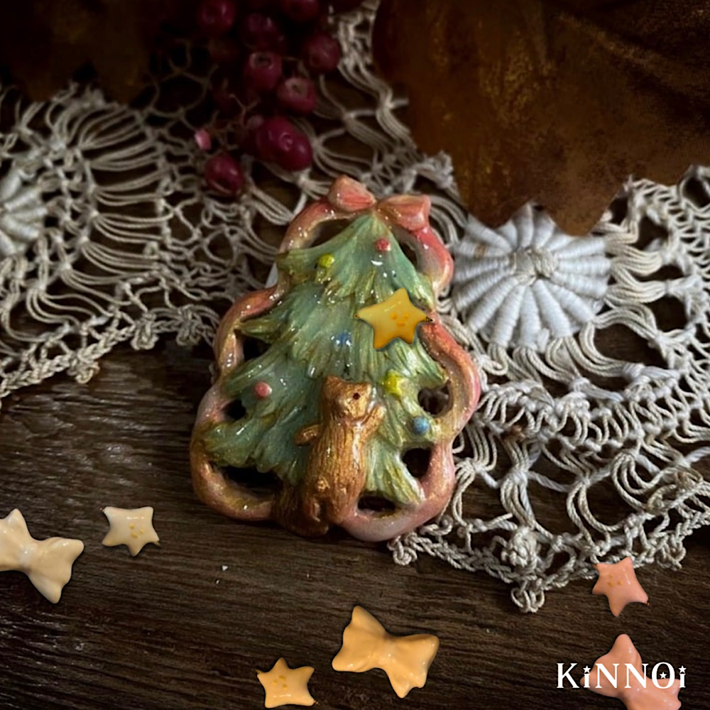 ツリー型のブローチに、小さなパーツを自由に重ねて貼りつけ、