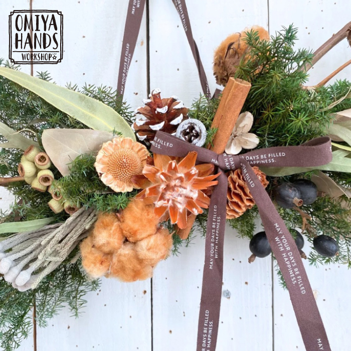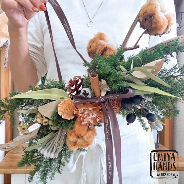 流木とプリザーブドグリーン、木の実を使ったナチュラルなスワッグ