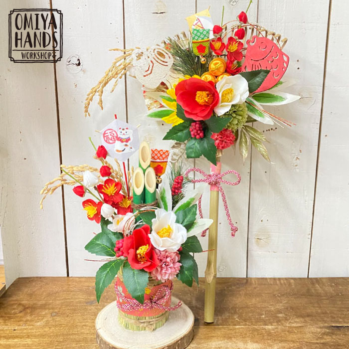 福を招く熊手アレンジとミニ門松アレンジをセットでつくります。