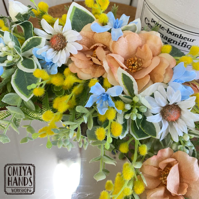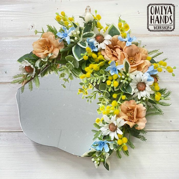 アーティフィシャルのミモザと鏡を組み合わせたアレンジです。