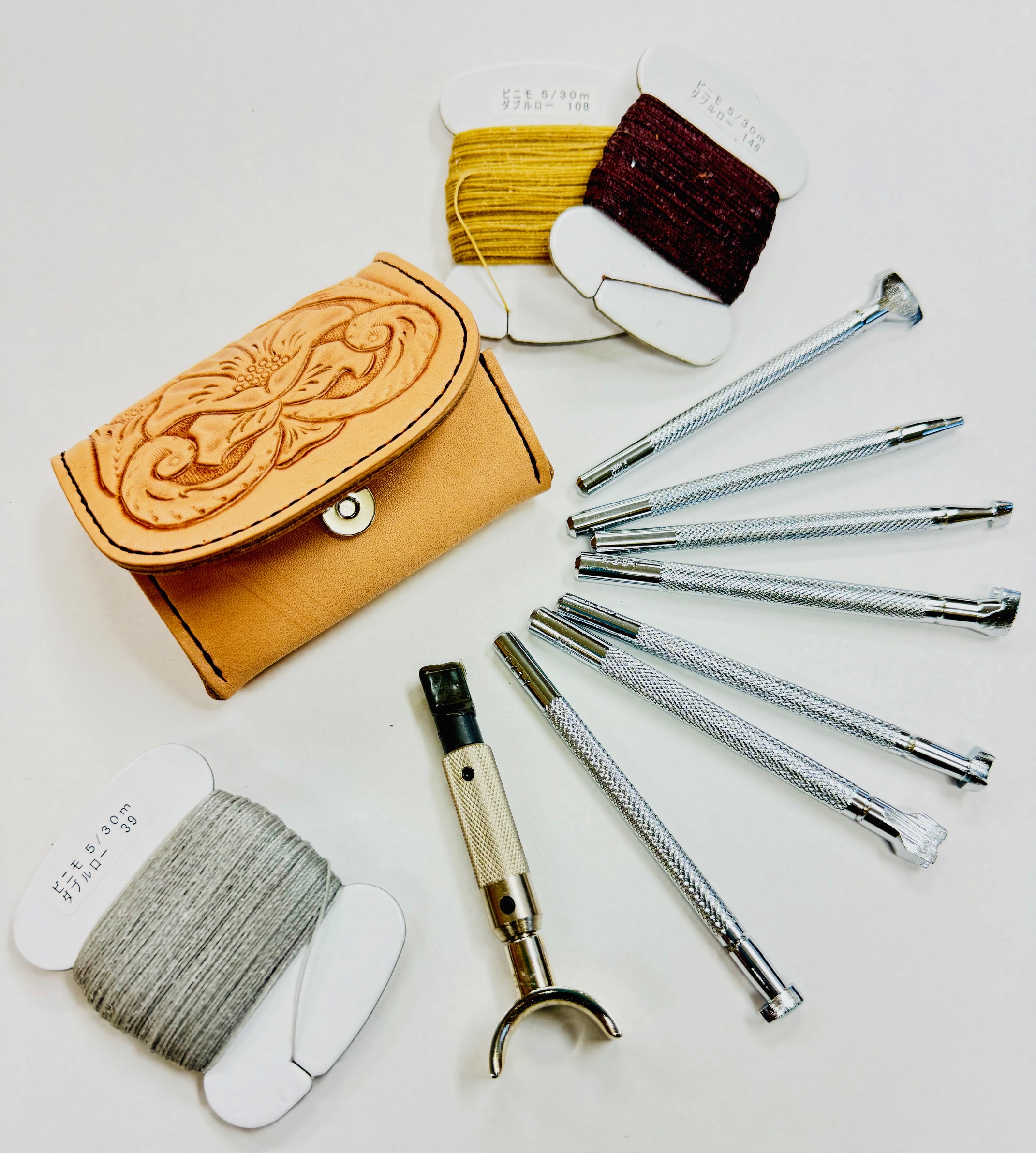 ベーシックなフラワーデザインをカービングします。 スェーベルカッターの使い方も学べます。栃木レザーのお手入れクリーム付きです。