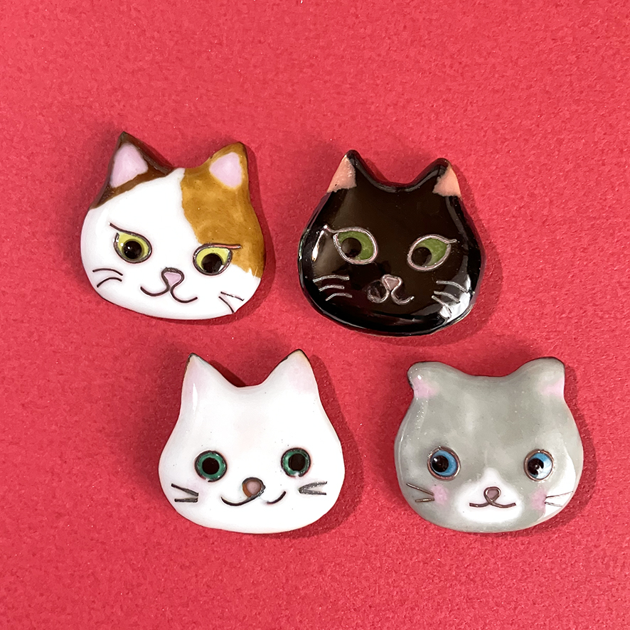 下焼き済みの銅板に、七宝の釉薬を盛りつけて、ガラスビーズや銅線のパーツを乗せ、電気炉で焼成し、3センチほどのネコの顔をつくります。完成後接着剤でブローチ金具を接着して仕上げ、お持ち帰りいただけます。