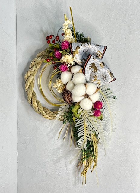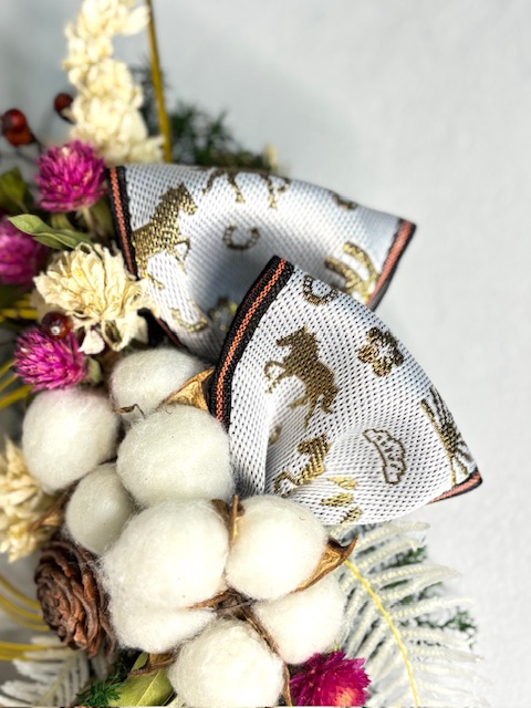 稲穂付きのしめ飾りに2026年干支のうまリボンを使用して、シンプルにかっこいいお正月飾りをつくりませんか。