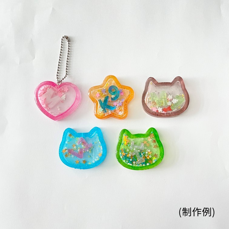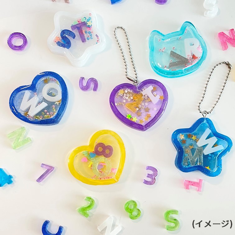 レジンでつくった「アルファベット」や「数字」のパーツなどを中に入れて自分だけのかわいいチャームがつくれます。