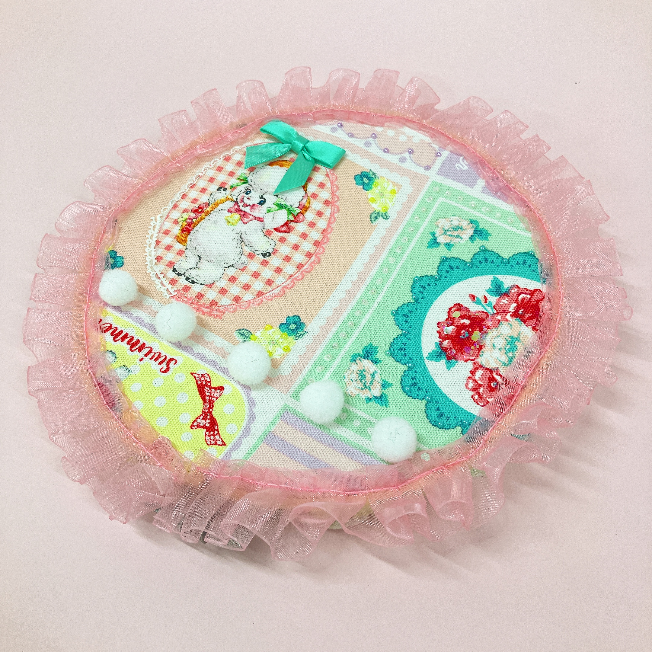 刺繍枠に生地を貼ったら、お好みのパーツを使用してデコレーション!