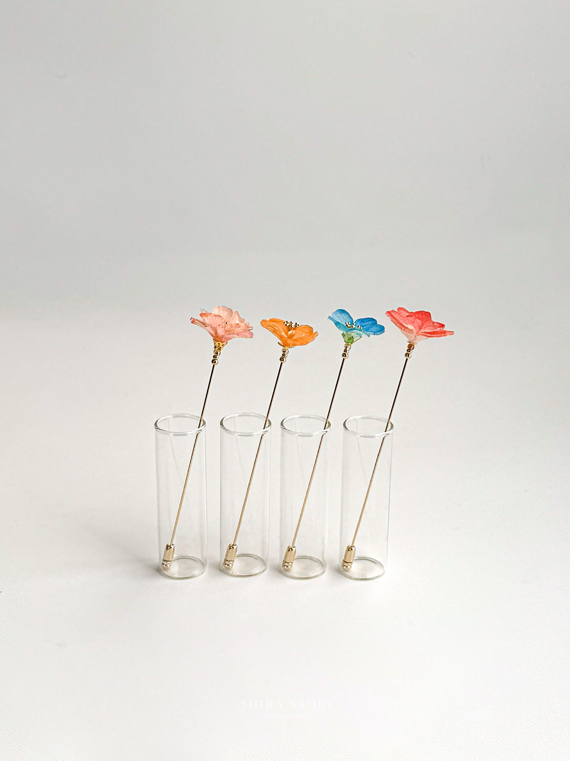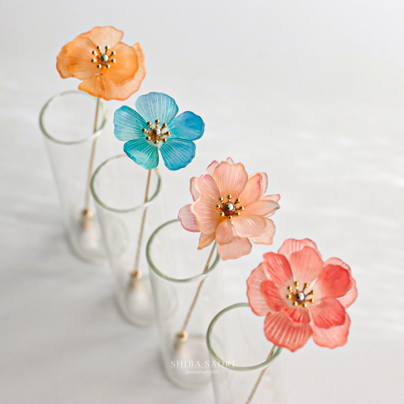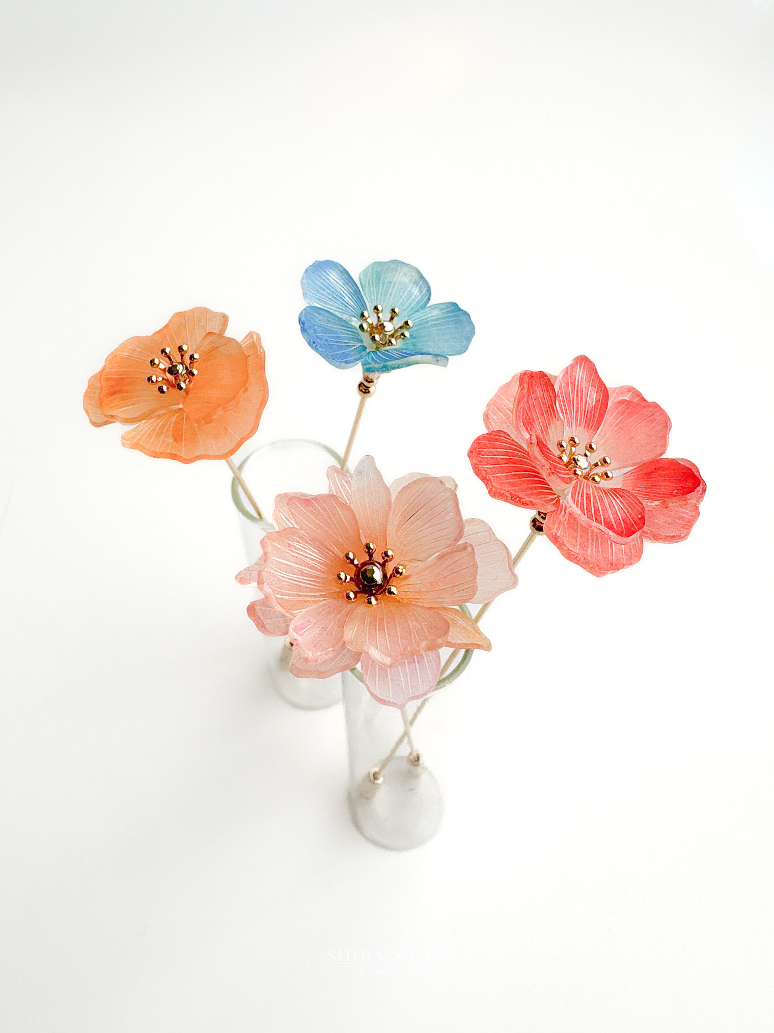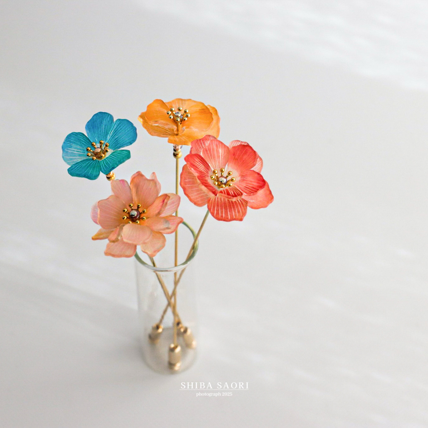 「暮らしに樹脂の花のひとときを」をコンセプトにプラバンで繊細な表情の花々を制作。