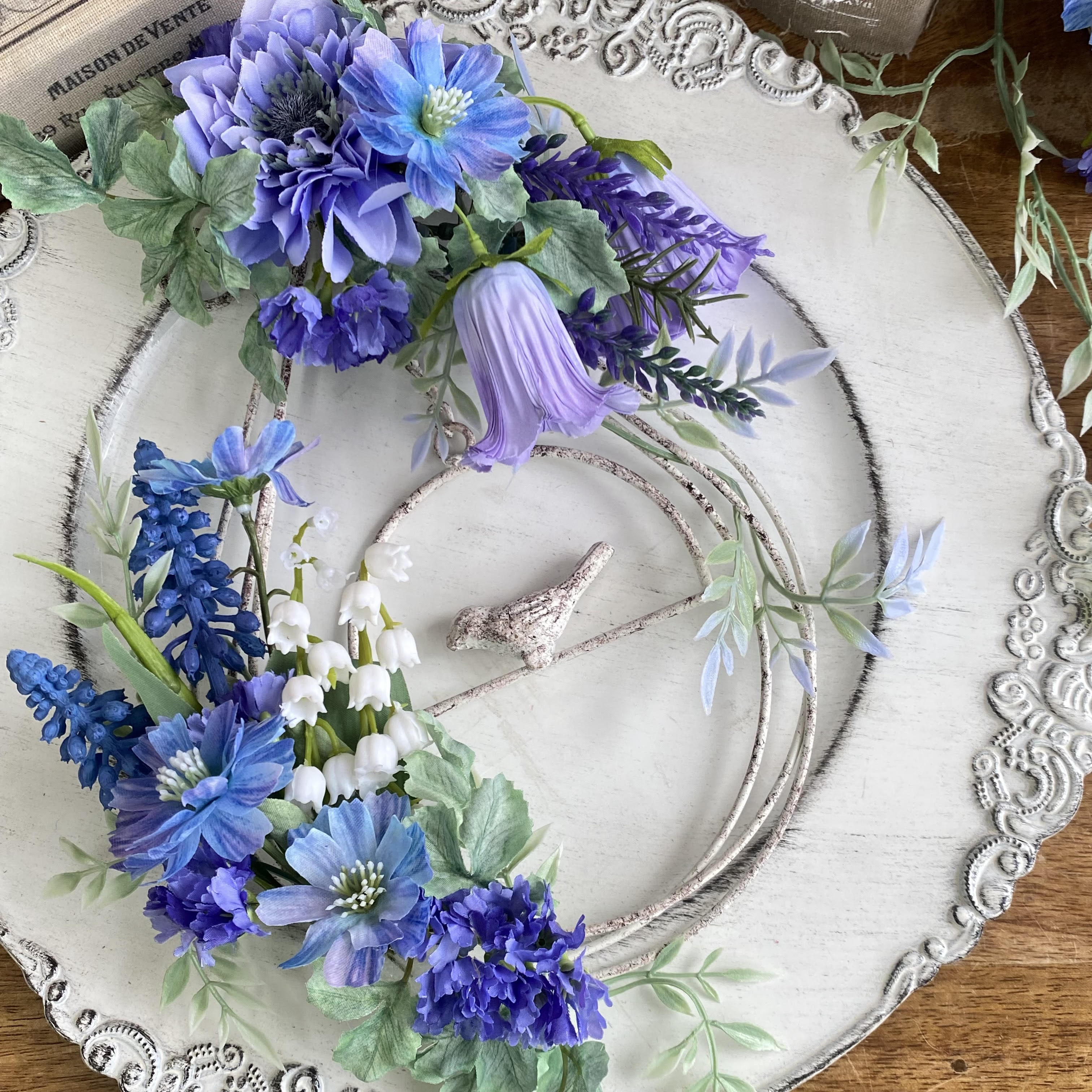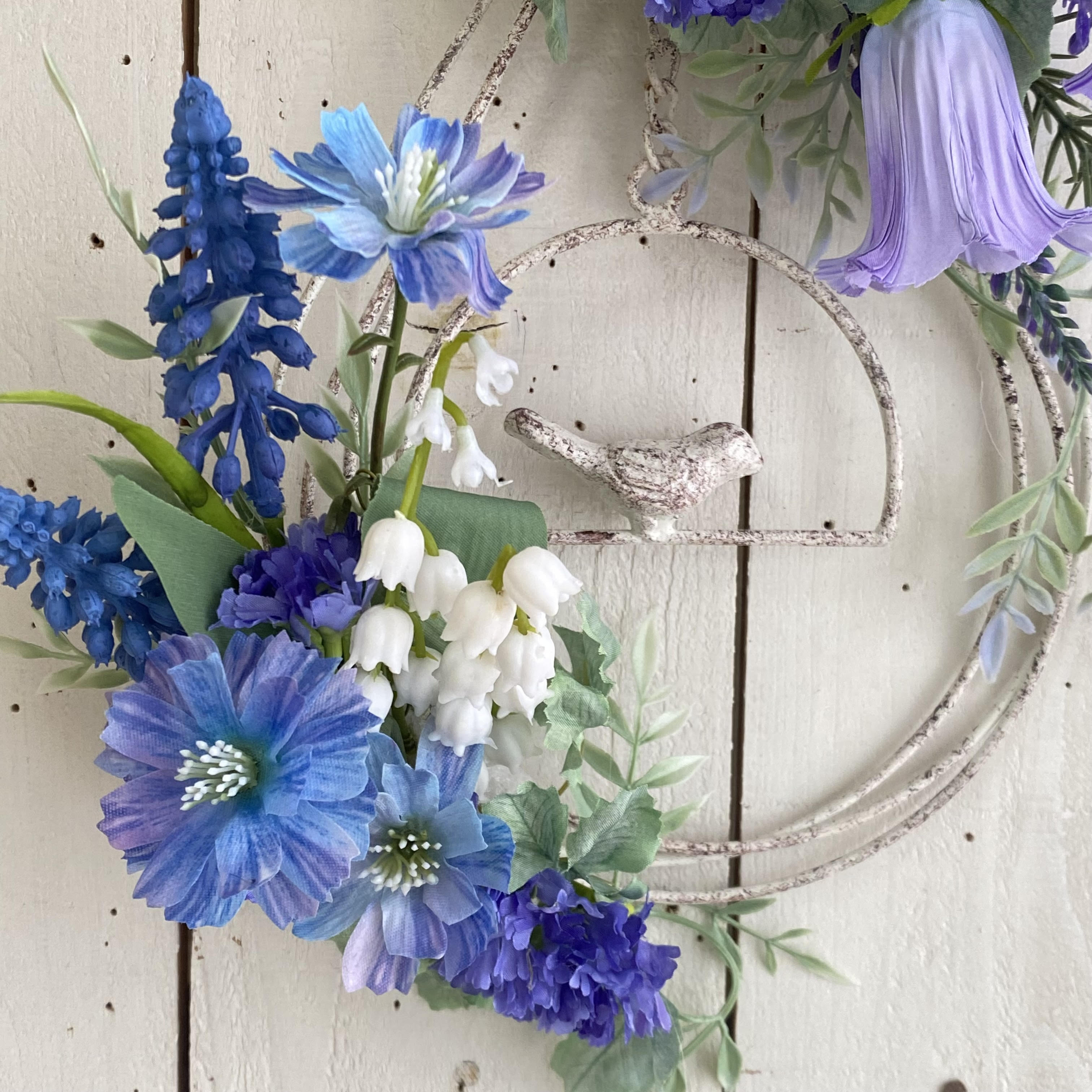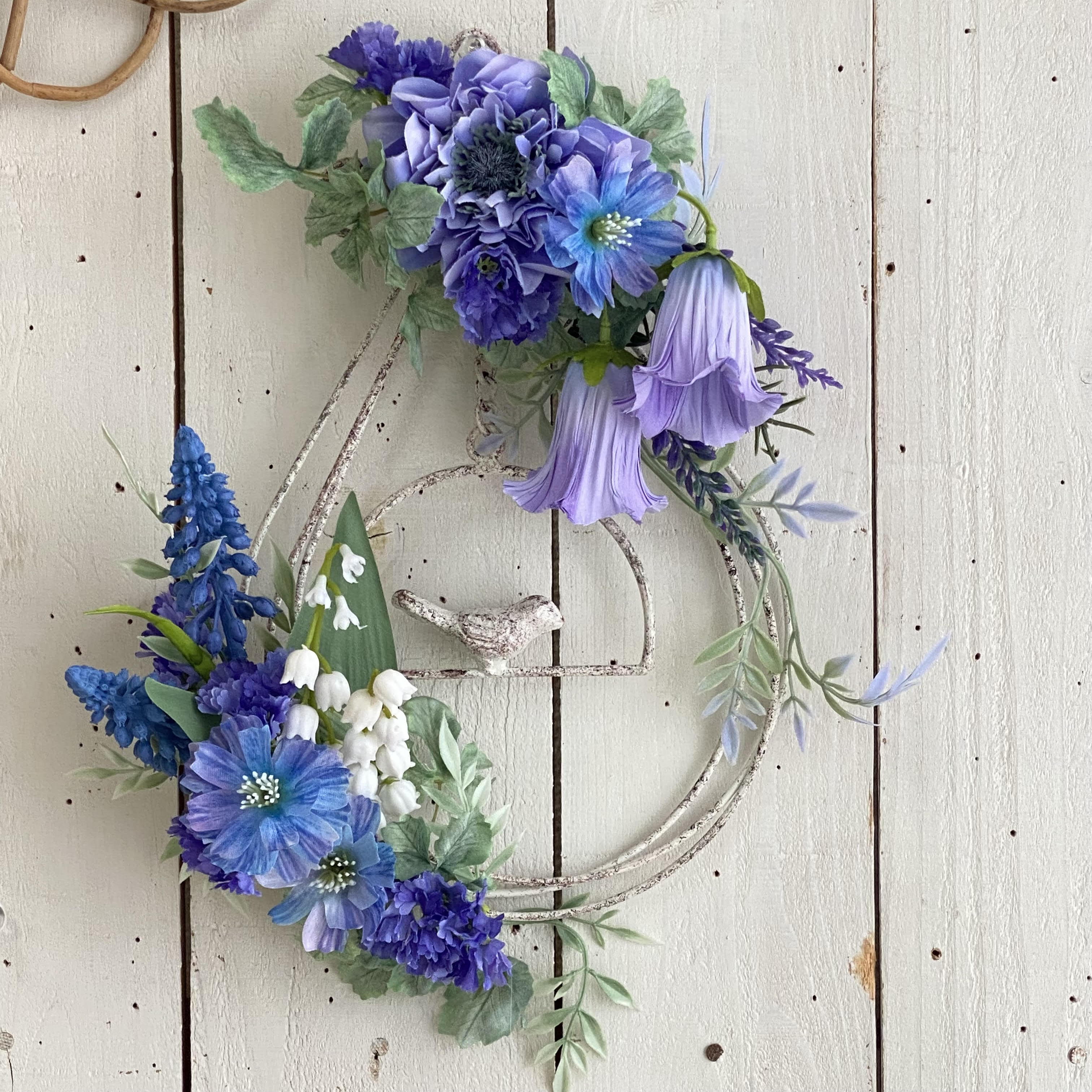ブルーの花々とすずらんでアレンジするドロップ型リース。小鳥がゆらゆらと揺れます。