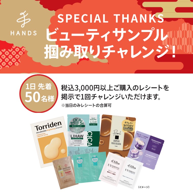 【一部店舗】初売祭 ビューティサンプル掴み取りチャレンジ! ハンズららぽーと富士見店