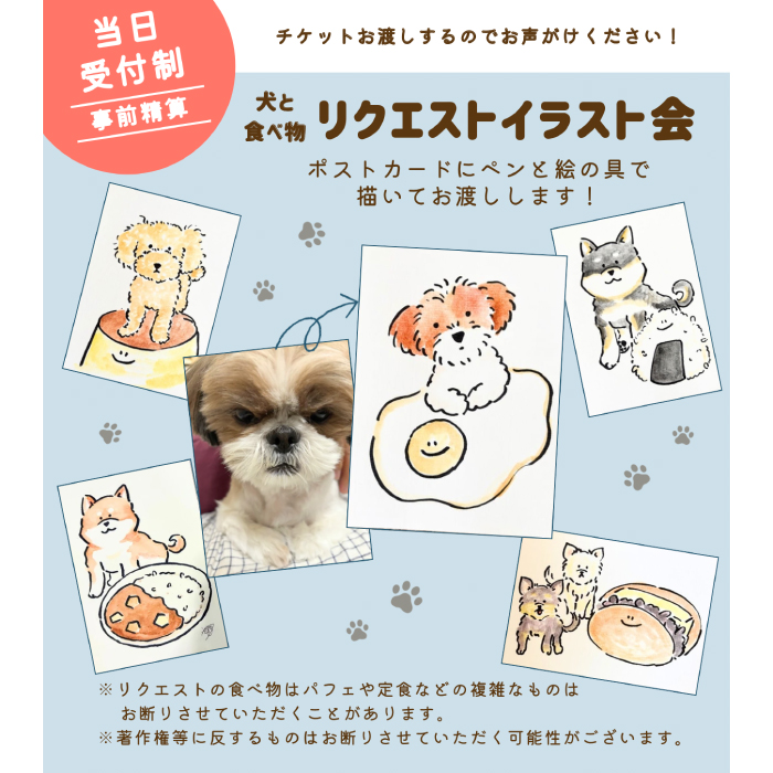 ポストカードに リクエストのわんちゃんと食べ物を ペンと絵の具で描いてお渡しします! ※リクエストの食べ物はパフェや定食などの複雑なものは、お断りさせていただくことがあります。 ポストカード1枚1頭につき1,100円(税込) ※1枚に1頭ずつ追加していく場合、1頭につき+550円(税込)